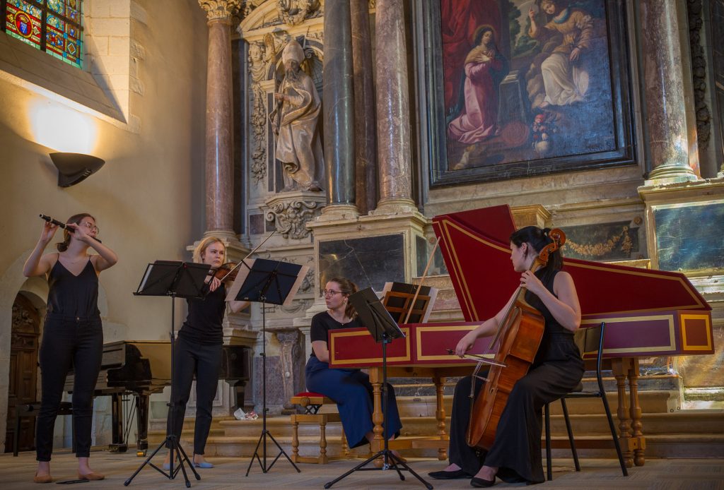 Fondé en 2019 par la violoniste Marta Korbel, l’Ensemble Cohaere s’est rapidement distingué deux ans après sa création en remportant avec brio en 2021 le Concours International de Musique Ancienne du Val de Loire (CIMA) qui avait pour thème La Sonate en trio à la fin du Grand Siècle, dont le jury était présidé par William Christie en personne (voir mon compte-rendu). Ce jeune ensemble exclusivement féminin se compose de Marta Korbel au violon, Monika Hartmann au violoncelle, Natalia Olczak au clavecin et Marta Gawlas à la flûte traversière baroque. Ces quatre jeunes musiciennes sont toutes issues de l’Académie de musique Karol Szymanowski de Katowice en Pologne ou elles se sont rencontrées à travers une passion commune pour la musique française. La qualité de leur interprétation de la musique française, dont elles avaient su à merveille restituer le style, avait alors enthousiasmé le jury et le public.
