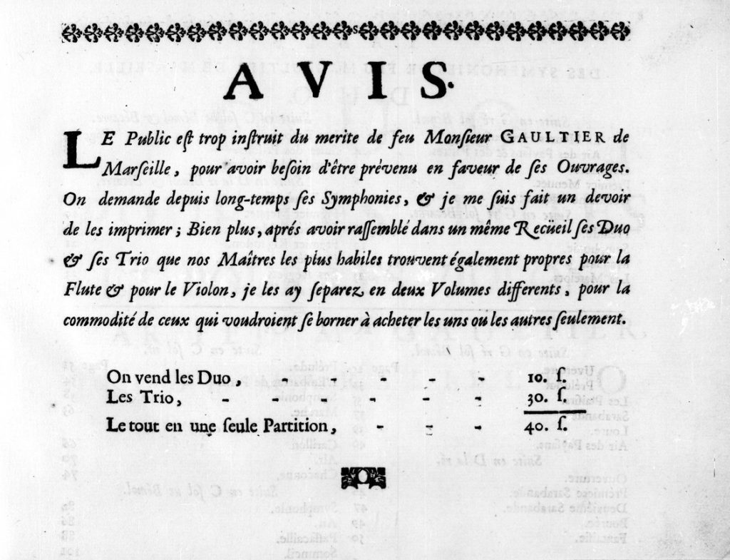Parmi les pièces qu’elles avaient présentées pour concourir figurait en particulier une Suite en sol mineur extraite des Symphonies en trio de Pierre Gaultier, un compositeur quelque peu délaissé qui eut pourtant son heure de gloire en cette seconde moitié du XVIIe siècle et fût notamment l’élève du claveciniste Jacques Champion de Chambonnières. Pierre Gaultier, dit Gaultier de Marseille, né en 1642 à La Ciotat, séjourne par deux fois à Paris et Versailles, il y découvre les fastueuses productions de Jean-Baptiste Lully et s’initie à son contact à l’opéra français. De retour à Marseille en 1681 en tant que maître de musique, il y créée en 1685 le tout premier opéra de province qui deviendra rapidement une véritable institution dans la cité phocéenne, et le centre de la vie musicale de toute une région. Pour ce faire, il obtient du Surintendant Lully le privilège exceptionnel de fonder ce premier théâtre lyrique provincial pour lequel il composera la musique et le livret de son premier opéra, Le Triomphe de la Paix. Il proposera ensuite rapidement des représentations dans toutes les grandes villes environnantes, notamment à Montpellier, Arles, Toulon et Aix-en-Provence, ainsi qu’à Lyon. Il est l’auteur d’au moins deux opéras (Le Jugement du Soleil et le Triomphe de la Paix) dont les manuscrits ont hélas été perdus ; ne subsistent que les livrets, et de Symphonies, divisées par suite de tons, des suites à la française en duos et trios, pour les flûtes et les violons qui font l’objet du présent enregistrement. Il convient tout d’abord de préciser que le terme symphonie avait à cette époque une toute autre signification. Si le terme actuel qualifie une œuvre écrite pour un grand orchestre, il désignait au XVIIe siècle la musique instrumentale par opposition à la musique vocale. Ces « symphonies » qui sont donc en réalité des suites ont fait l’objet d’une publication posthume en 1707 (à consulter ici), motivée par une demande publique comme le souligne la préface de l’éditeur. On peut logiquement en déduire que le travail de composition de Pierre Gaultier était connu et reconnu bien qu’il ait principalement exercé en dehors des cénacles parisien et versaillais. Enfin, comme l’évoque Titon du Tillet dans Le Parnasse François : « Ce Musicien périt malheureusement avec tous les Acteurs et les Actrices qui composoient son Opéra : ce fut au mois de Septembre 1697 qu’après avoir fait exécuter à Montpellier un Opéra et quelques divertissements de sa façon, s’étant embarqué avec tout son équipage au Port de Sète en Languedoc pour regagner Marseille, le vaisseau fut submergé, et périt à la vue du Port de Sète, sans qu’on ait jamais pu retrouver aucun débris de ce vaisseau, ni de tout ce qui étoit dedans ».